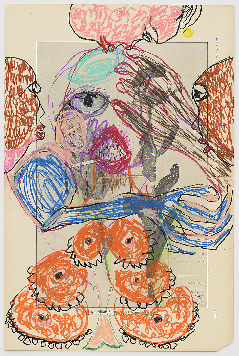 • wax pastel and colored pencil on paper